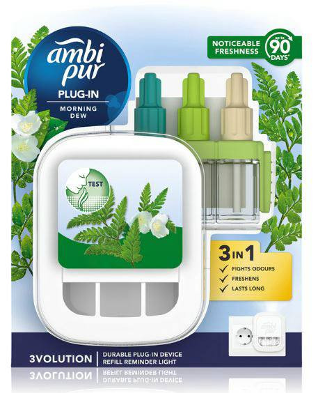 Az Ambi Pur 3Volution Morning Dew folyamatosan szünteti meg a kellemetlen szagokat és váltogatja a 3 egymást kiegészítő illatot, így a frissesség mindig érezhető. Akár 90 napon át tart (alacsony fokozaton, napi 12 órás használat esetén). Fedezze fel a kettős hatású Morning Dew szépségét