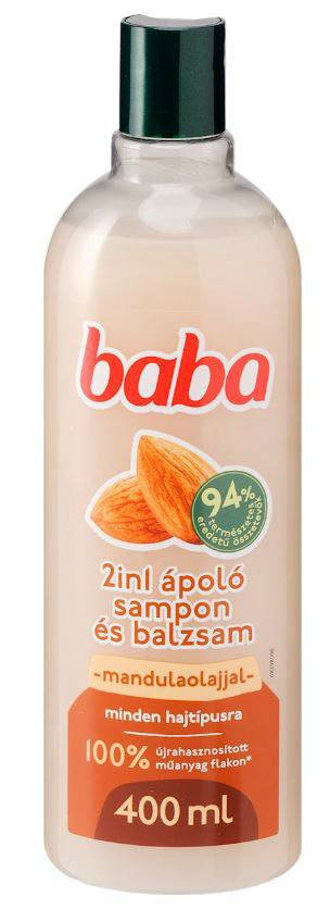 A Baba 2in1 sampon és balzsam mandulaolajjal nemcsak tisztít, hanem ápol és kondicionál is. 94%-ban természetes eredetű összetevőket tartalmaz, és gyengéd formulája természetes eredetű édesmandula-olajjal gazdagított.
