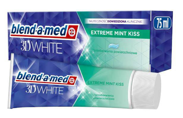 A klinikailag igazolt Blend-a-med 3D White Extreme Mint Kiss 3 az 1-ben hatású fogkrém: eltávolítja a felületi elszíneződéseket, már a legelső használattól kezdve fehérít, illetve erősíti és óvja a fogakat.