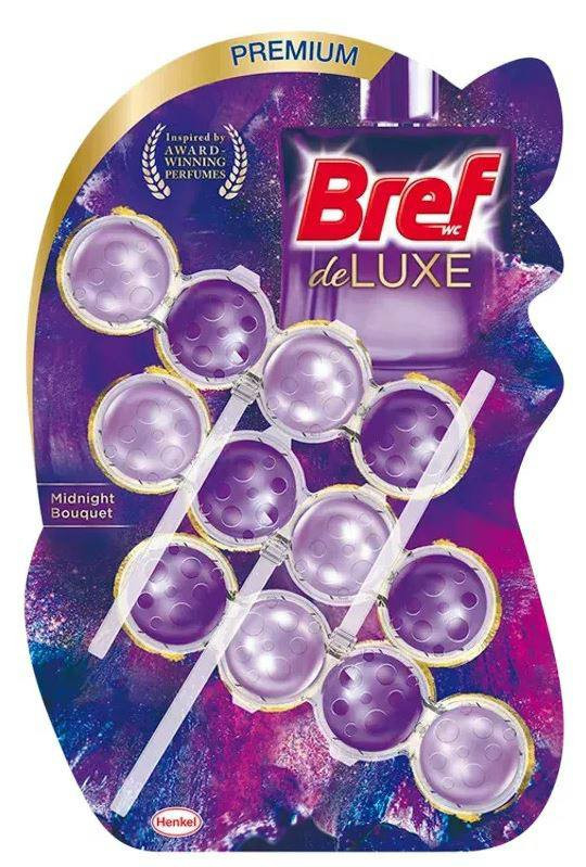 A Bref DeLuxe Midnight Bouquet WC-blokk (3 × 50 g) luxuskategóriás illatosító, amely minden öblítéskor aktív habot hoz létre, hatékonyan tisztít, megelőzi a vízkőképződést, és akár 30 napon át tartó frissességet biztosít éjszakai harmat illattal.