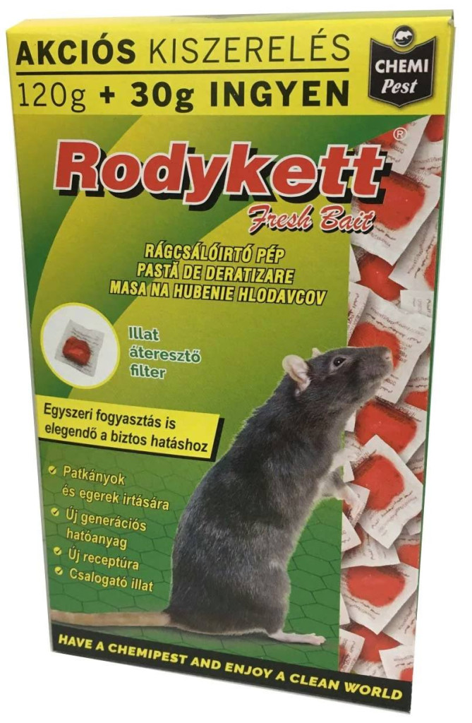 A Rodykett rágcsálóirtó pép egy olyan új összetételű termék, amely a patkányok és egerek által rendkívül kedvelt ízénél és korszerű difenakum véralvadásgátló hatóanyagánál fogva lehetővé teszi az óvatos kártevők gyors és biztos kiirtását.