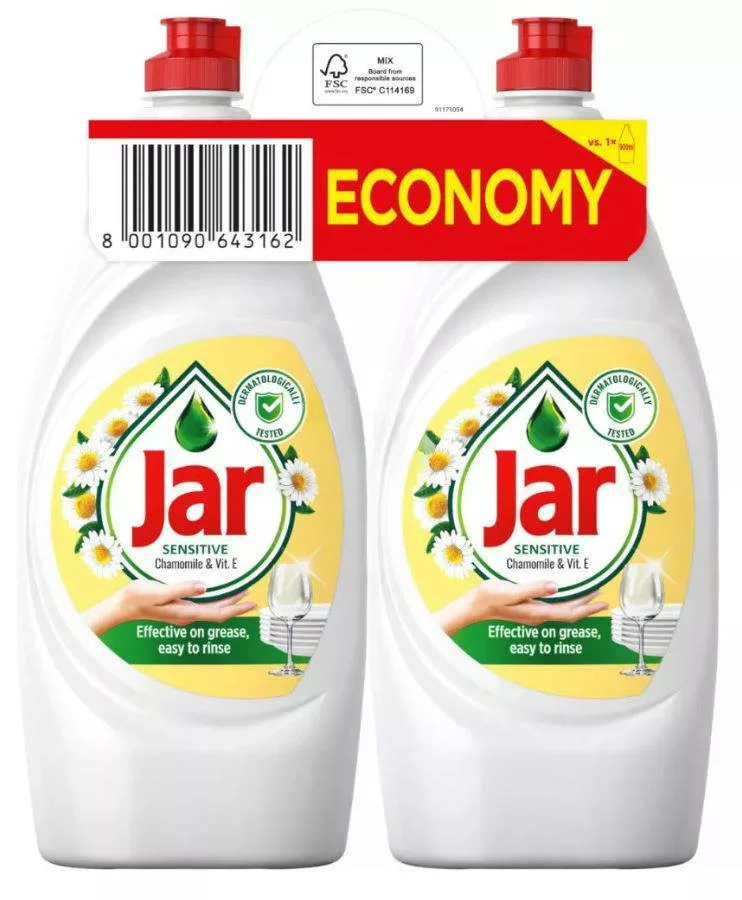 Jar Sensitive Chamomile & Vitamin E kézi mosogatószer 2x900ml kíméletlenül elbánik a zsírral ugyanakkor gyengéd a kézekhez. A Jar intenzív formulája elbánik a zsíros szennyeződésekkel, mindent tisztává varázsol és leegyszerűsíti a mosogatást.