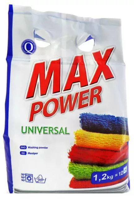 A Max Power márkájú univerzális mosópor kiváló választás mind a kézi, mind a gépi mosáshoz. Eltávolítja a foltokat minden típusú fehér és színes ruhából.