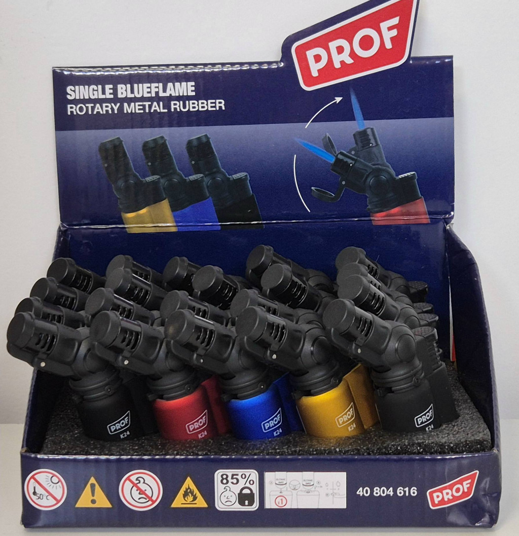 Metálszínű fém test, 4 színben, kék színű viharlánggal, újratölthető.