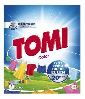 Tomi Color por állagú mosószer színes ruhákhoz. Erőteljes új formulájának köszönhetően a Tomi a legmakacsabb foltokat is eltávolítja. Hatékony minden mosási fokozaton, akár 20°C fokon is, energiát megtakarítva.