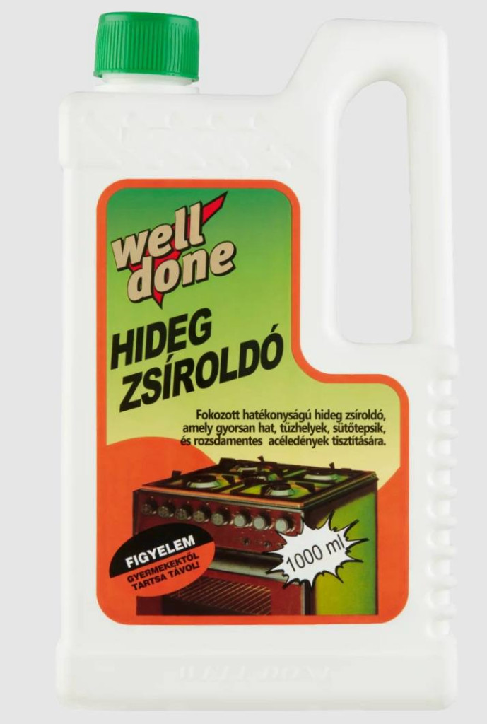 Fokozott hatékonyságú hideg zsíroldó, amely gyorsan hat,tűzhelyek, sütőtepsik, és rozsdamentes acéledények tisztítására.
