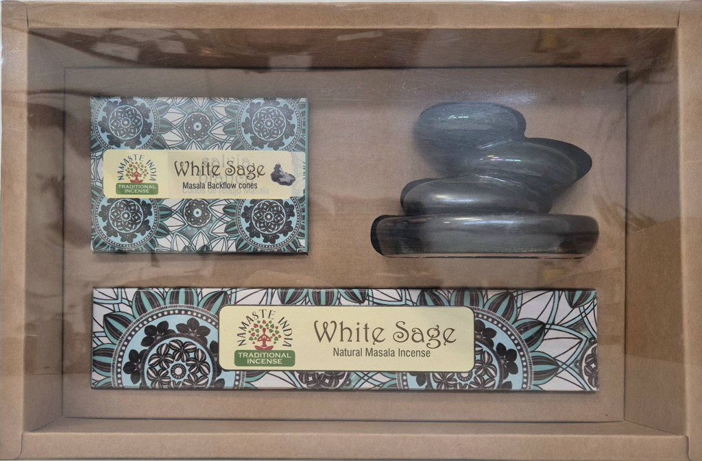 ZenHome Kerámia szett "Kő" - Füstölővel és kúpfüstölővel/ Fehér Zsálya