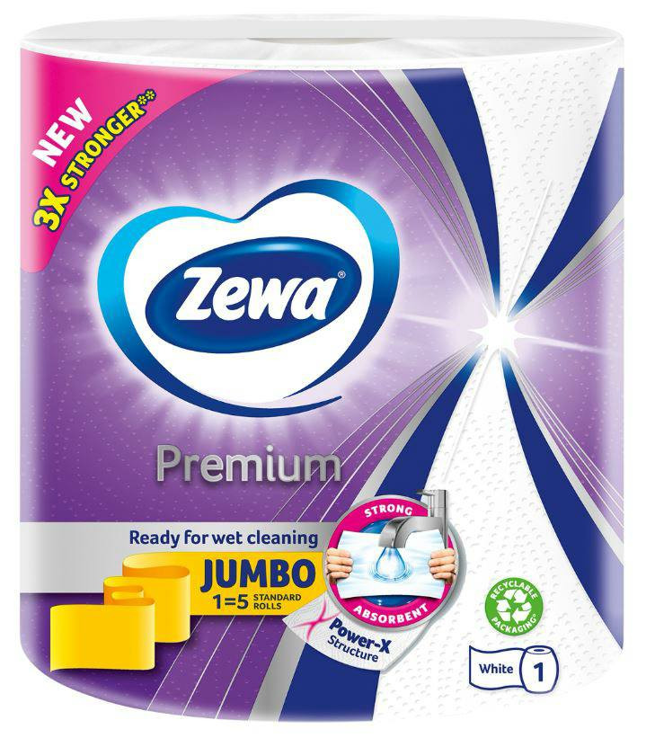 A Zewa Premium Jumbo 3 rétegű 230 lapos erős és kiváló nedvszívó háztartási papírtörlő mérete révén kiemelkedően hosszú ideig praktikus tisztaságot biztosít. Háromszor erősebb a korábbi Zewa papírtörlőkhöz képest. 23,4 x 22,5cm lapméret